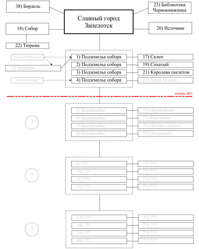 Составил блок-схему локаций. Серым шрифтом указаны ещё не созданные локации. Теперь наглядно видно, сколько сделано и сколько осталось.
